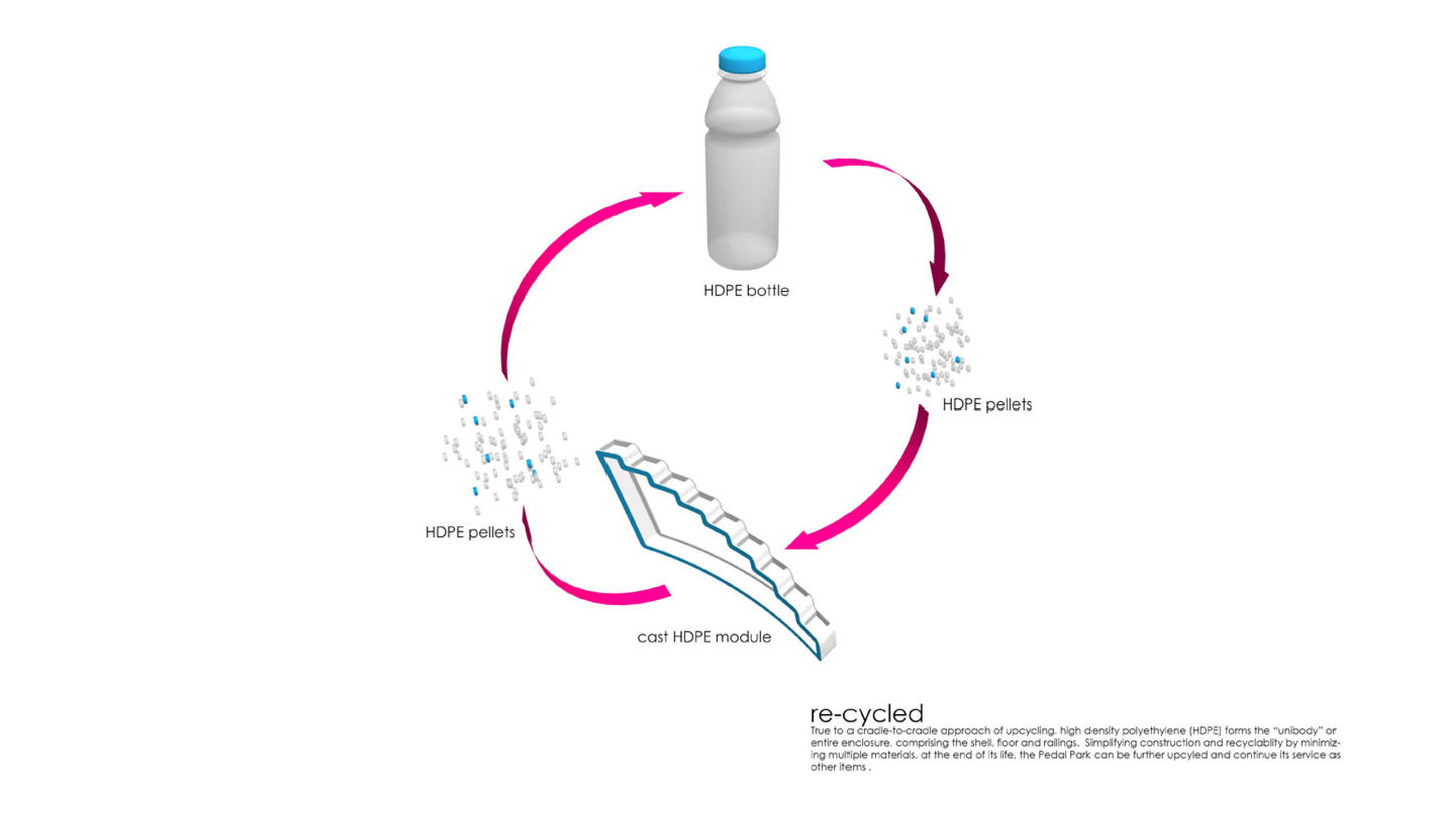 The design utilizes recycled high-density polyethylene from plastic bottles and doubles as a standing place for events, promoting a sustainable lifestyle. The modular and flexible design facilitates easy delivery and adaptability to different locations, showcasing KGP's commitment to merging functionality with sustainability in urban spaces.